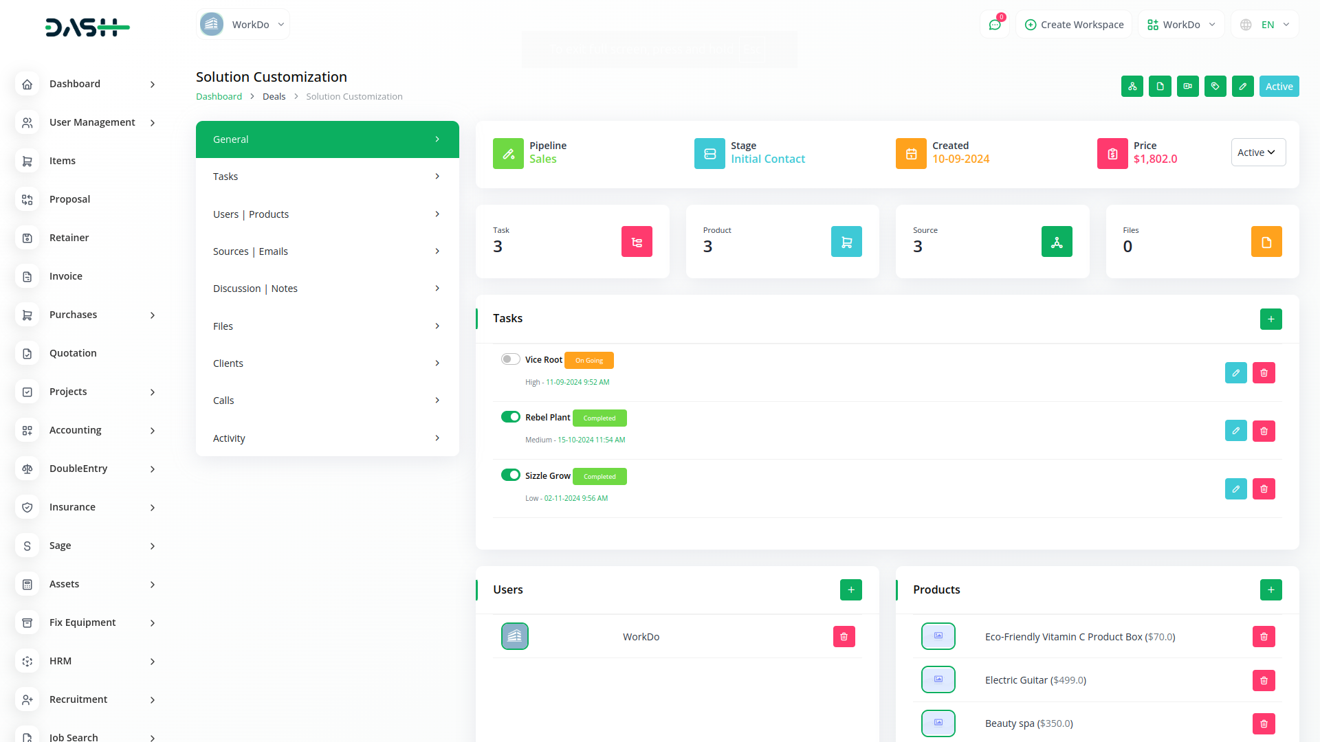 Get an actionable analysis of all your leads, deals, users, invoices, and products - in one interactive dashboard. Create and implement effective business plans, set a maximum number of deals, payment options and do so much more.